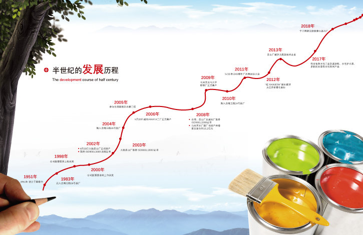 1983年臺灣總公司遷至現(xiàn)址后,陸續(xù)添購土地廠房,增添新型機械及計算機配色、精密檢驗儀器,更不斷開發(fā)高級特殊涂料,頗具成效,1999年后陸續(xù)在上海昆山、越南、馬來西亞、美國等地設(shè)廠,進而與世界著名公司技術(shù)合作,生產(chǎn)高品質(zhì)的建筑、防火、防蝕、船舶及彩色鋼卷等涂料,充分供應(yīng)國內(nèi)外各行各業(yè)日新月異的需求。